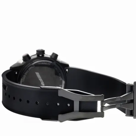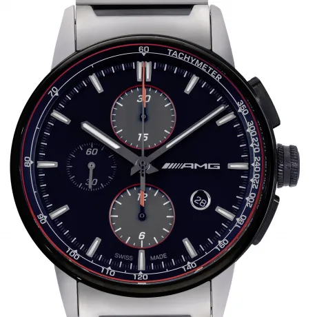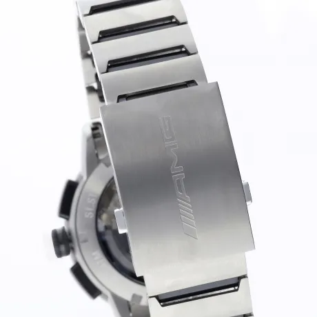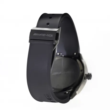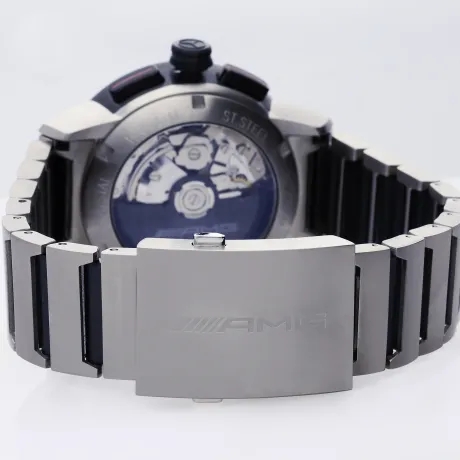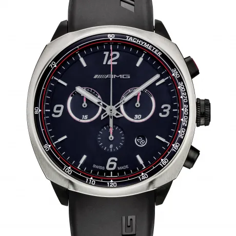 Com a pulseira de titânio, o relógio é confortável no pulso e o mostrador possui várias camadas, contando com índices aplicados, ponteiros luminescentes e janela de data. O cristal de safira é antirreflexo em ambos os lados, apresentando finos contornos vermelhos ao redor dos contadores e o logo AMG brilhante acentuam o visual. Como verdadeiro cronógrafo, o relógio também possui função de cronômetro. Apesar de seus diversos elementos esportivos, este modelo é refinado e imponente, além de ser o companheiro ideal para negócios e lazer, contando com 43,5 mm, espessura de 15 mm e resistência à água de 5 ATM.