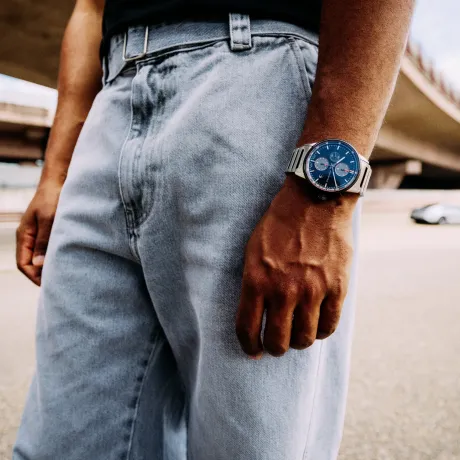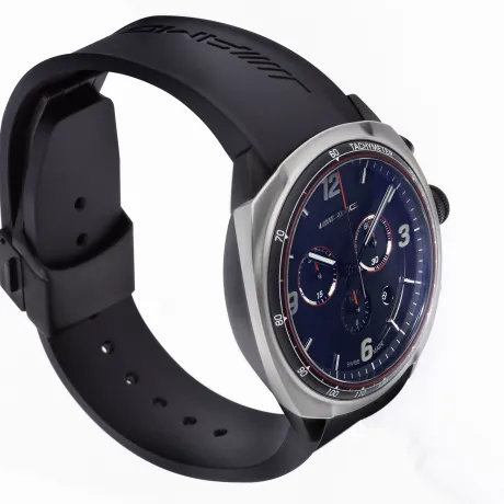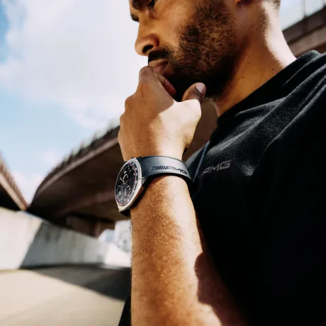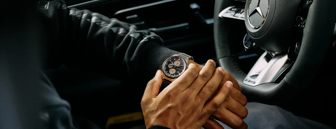Esse novo cronógrafo esportivo da Mercedes-AMG foi desenvolvido para quem não apenas mede o tempo, mas deseja dominá-lo. Equipado com o movimento suíço de quartzo Ronda 5030, ele oferece função precisa de cronômetro. A caixa segue a linguagem de design da AMG, apresentando construção em múltiplas partes e uma combinação sofisticada de titânio leve e aço inoxidável, resultando em uma sensação de alta qualidade ao ser usado. Além disso, o bisel em cerâmica preta fosca com escala taquimétrica branca é o destaque funcional que reforça o caráter esportivo do relógio.