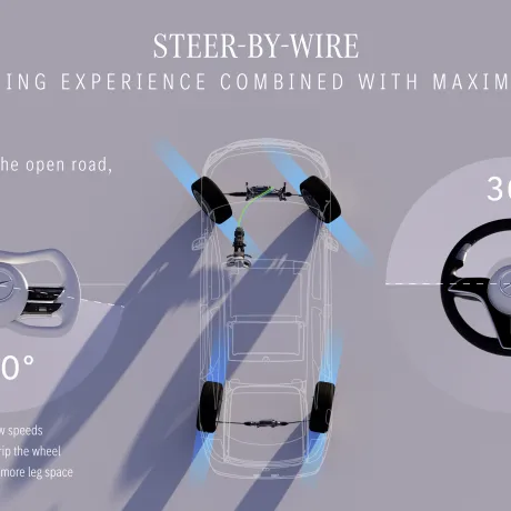 A tecnologia steer-by-wire da marca oferece uma experiência de direção segura e confortável, especialmente no Vision Iconic, onde a interação com a direção do eixo traseiro facilita a dirigibilidade, manobras e estacionamento. Ela reduz o esforço do motorista e elimina a necessidade de reposicionar as mãos no volante, transmitindo os comandos eletricamente sem conexão mecânica. Além disso, essa tecnologia permite maior liberdade no design interno e, junto com sistemas avançados de condução automatizada, possibilita ao condutor assumir uma posição mais relaxada no banco dianteiro luxuosamente estofado.