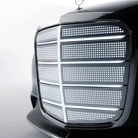 Com sua ampla moldura cromada, estrutura em treliça de vidro fumê e iluminação integrada no contorno, a grade icônica funde herança e modernidade digital, irradiando presença, status e um forte senso de identidade da marca. Esta nova face da empresa foi apresentada pela primeira vez no novo GLC elétrico em setembro de 2025 e o Vision Iconic reforça essa forte presença ao iluminar também a estrela vertical no capô.