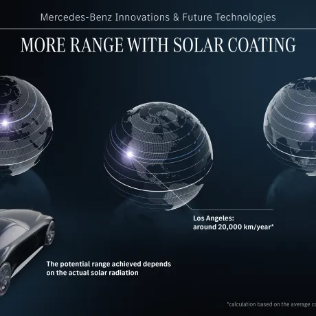 A Mercedes-Benz está desenvolvendo módulos solares inovadores que podem ser aplicados de forma contínua à carroceria de veículos elétricos, em uma pasta ultrafina. A superfície fotovoltaica ativa é adaptável a diversos substratos. Quando instalada em toda a área do Vision Iconic, é possível captar energia solar extra, dependendo da localização e das condições locais. Por exemplo, uma área de 11 metros quadrados (equivalente à de um SUV médio) poderia gerar energia suficiente para até 12.000 quilômetros por ano em condições ideais. O revestimento não contém terras raras nem silício, é facilmente reciclável e possui alta eficiência de 20%, produzindo energia continuamente, mesmo com o veículo desligado.