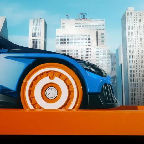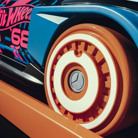 A paleta de cores segue a estética icônica da Hot Wheels, com tons vibrantes de laranja, rosa e azul. Chamas de grandes proporções conferem um visual retrô futurista que remete à cultura pop dos anos 1980. O Mercedes-Benz CLA será transformado em um modelo Hot Wheels fundido em metal, que chegará ao mercado em 2026. Essa versão em miniatura da peça artística cria uma ponte entre a inovação automotiva e o mundo dos brinquedos, atraindo tanto a crescente comunidade de colecionadores dos modelos, quanto uma nova geração de fãs.