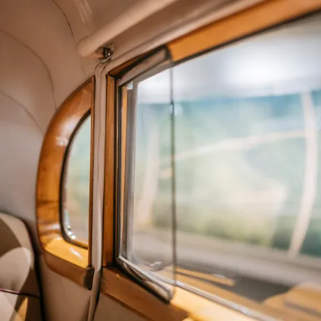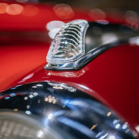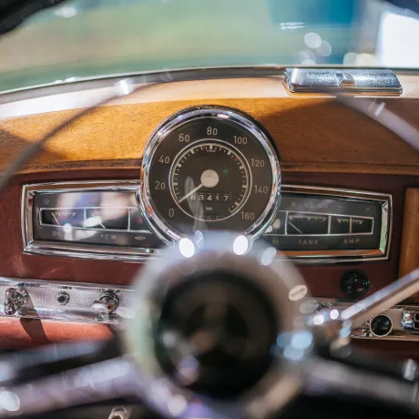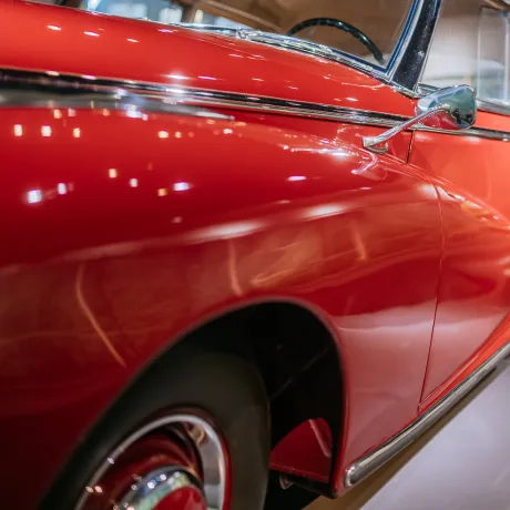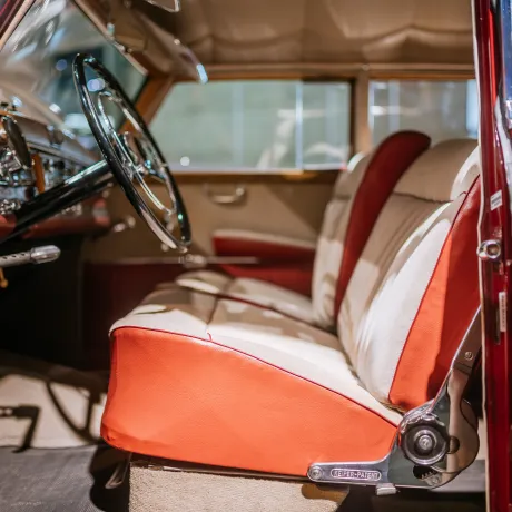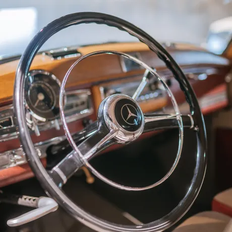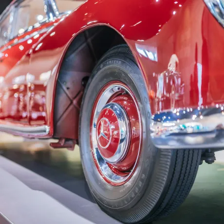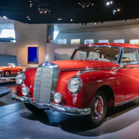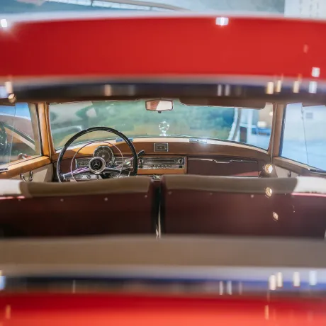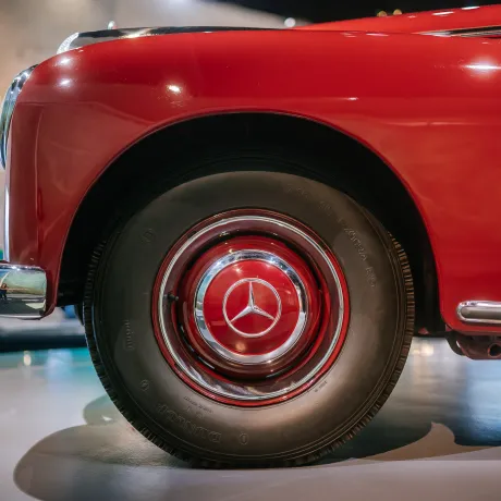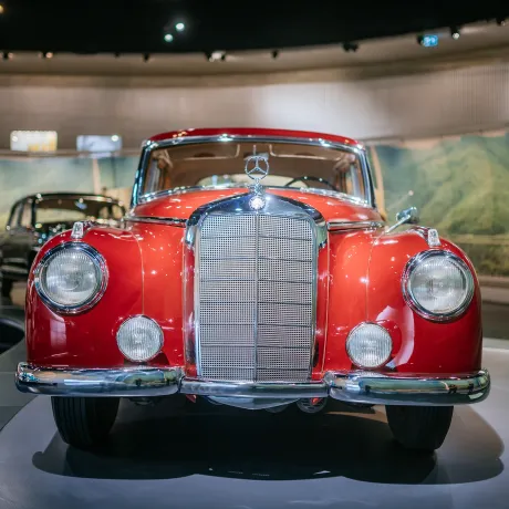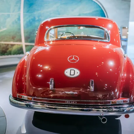 Apresentado originalmente em 1951, o Mercedes‑Benz 300 foi o sedã que definiu o luxo na Alemanha dos anos 1950 e consolidou a posição da marca no segmento topo de linha. O exemplar em exibição no museu chama atenção pela pintura vermelho brilhante e pelas proporções imponentes, traduzindo conforto, elegância, segurança e aspirações sociais típicas do período do chamado milagre econômico. O interior revela o alto nível de artesanato que tornou o modelo um marco da engenharia automotiva alemã. Materiais de alta qualidade, painéis internos cuidadosamente acabados e detalhes em madeira no painel e nos contornos das janelas, reforçam o caráter sofisticado do sedã, valores que ainda hoje orientam a personalização dos veículos Mercedes‑Benz.