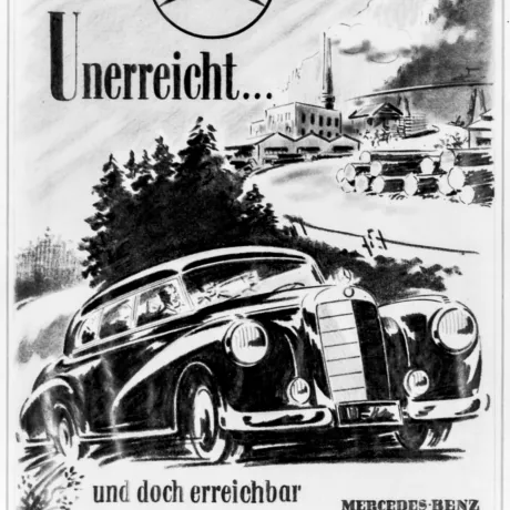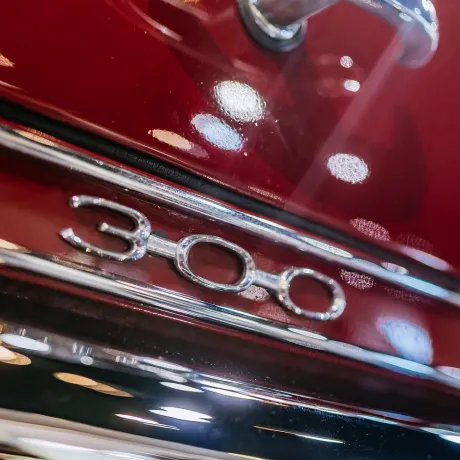 Produzido em 1952, o Mercedes‑Benz 300 era o maior e mais rápido automóvel fabricado em série na Alemanha. Seu porta‑malas amplo, de fácil acesso e com compartimentos laterais para rodas sobressalentes, reforçava o caráter funcional do sedã de luxo. A designação “300” aparece de forma discreta na traseira, número que também identificava outros modelos marcantes da marca, como o 300 S e o lendário 300 SL.